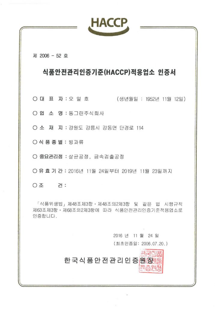 HACCP 인증서(빙과)