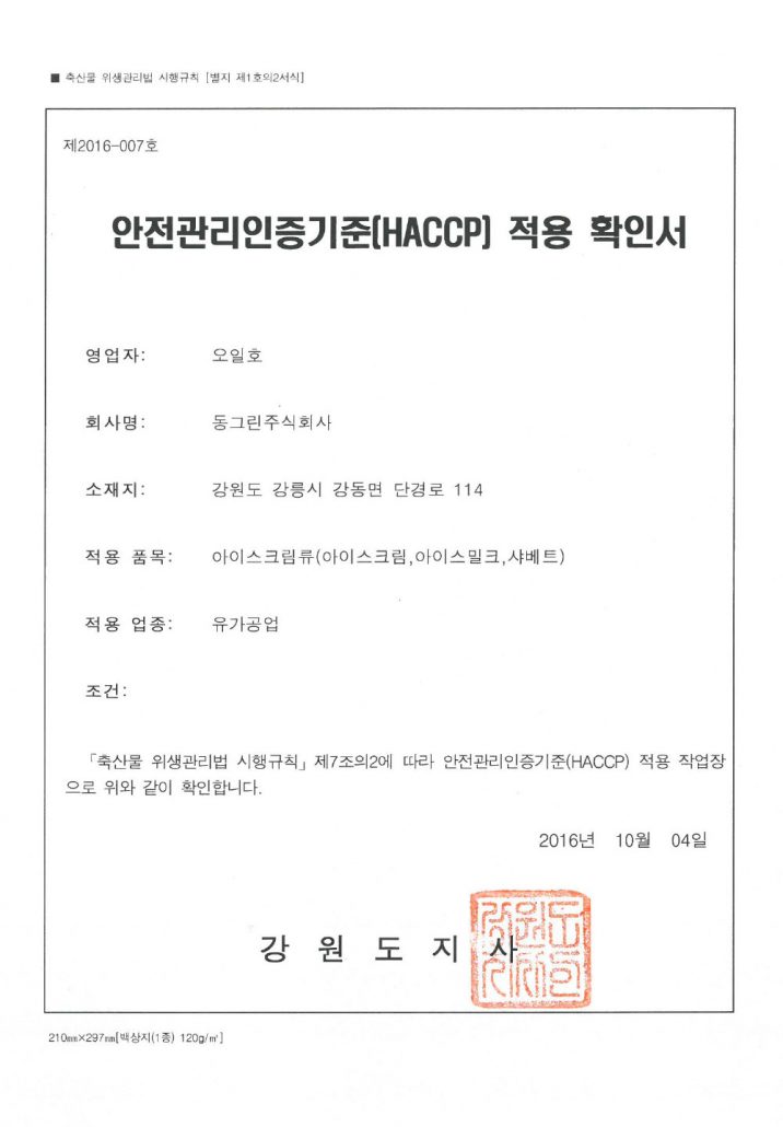 아이스크림 HACCP인증서 획득(식품의약품안전청)