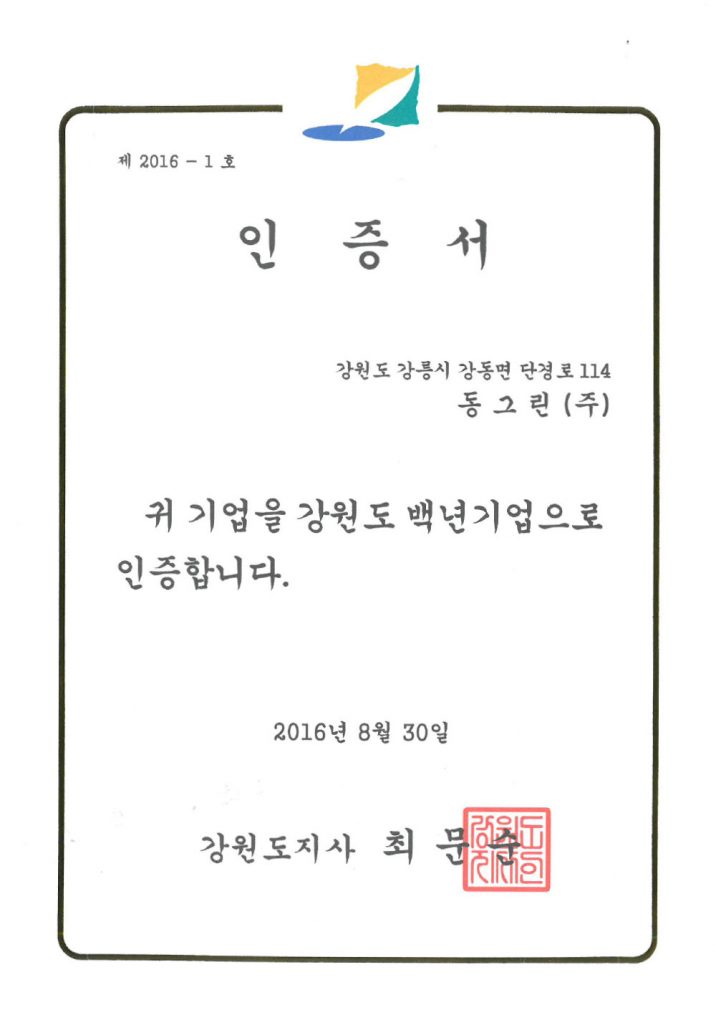 강원도 백년기업 인증서