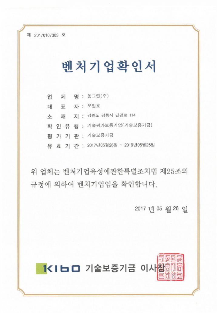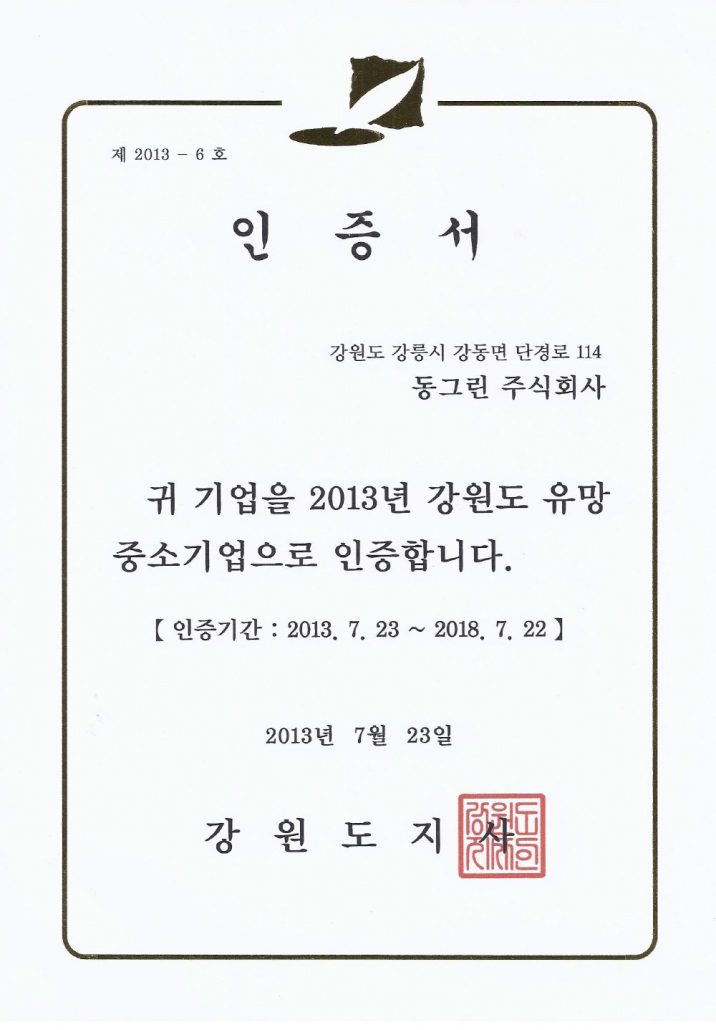 강원도 유망중소기업 인증서