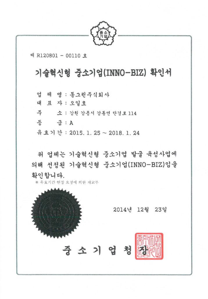 기술혁신형 중소기업(INNO-BIZ)확인서