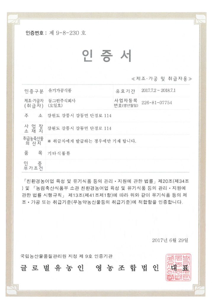 유기가공 인증서