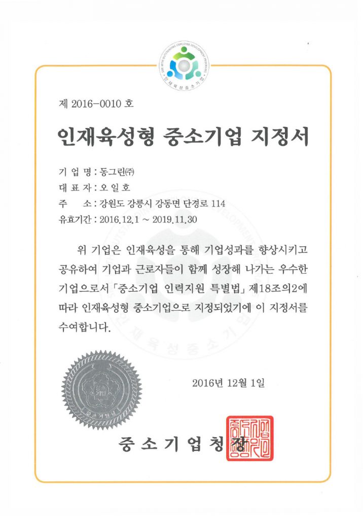 인재육성형 중소기업 지정서